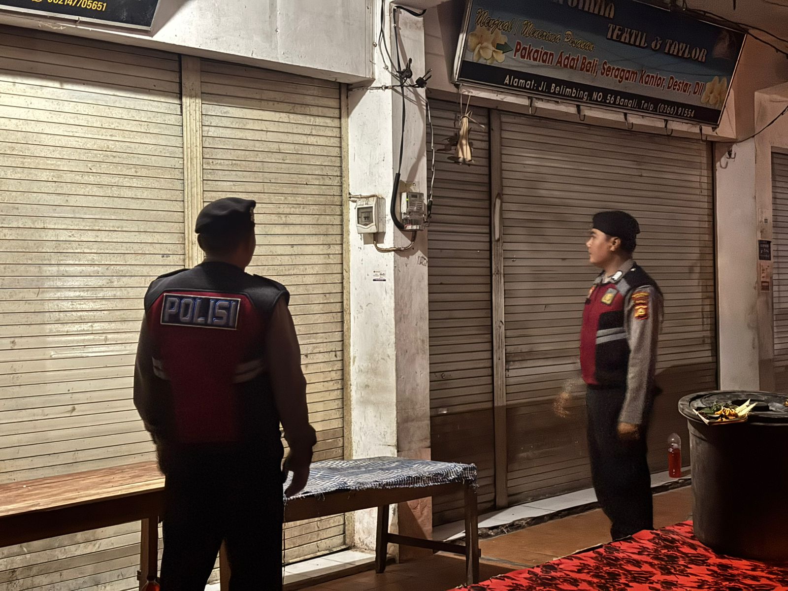 Antisipasi Gangguan Kamtibmas Pada Malam Hari, Personil Samapta Polres Bangli Lakukan Patroli Malam di Areal Pertokoan Pasar Kidul Bangli.