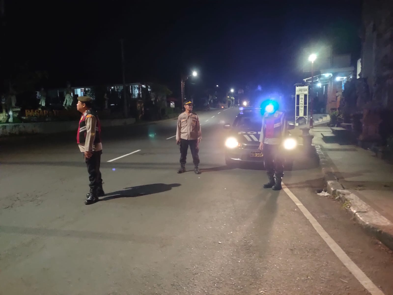 Antisipasi Gangguan Kamtibmas Pada Malam Hari, Personil Samapta Polres Bangli Lakukan Patroli Malam di Areal Pertokoan Pasar Kidul Bangli.