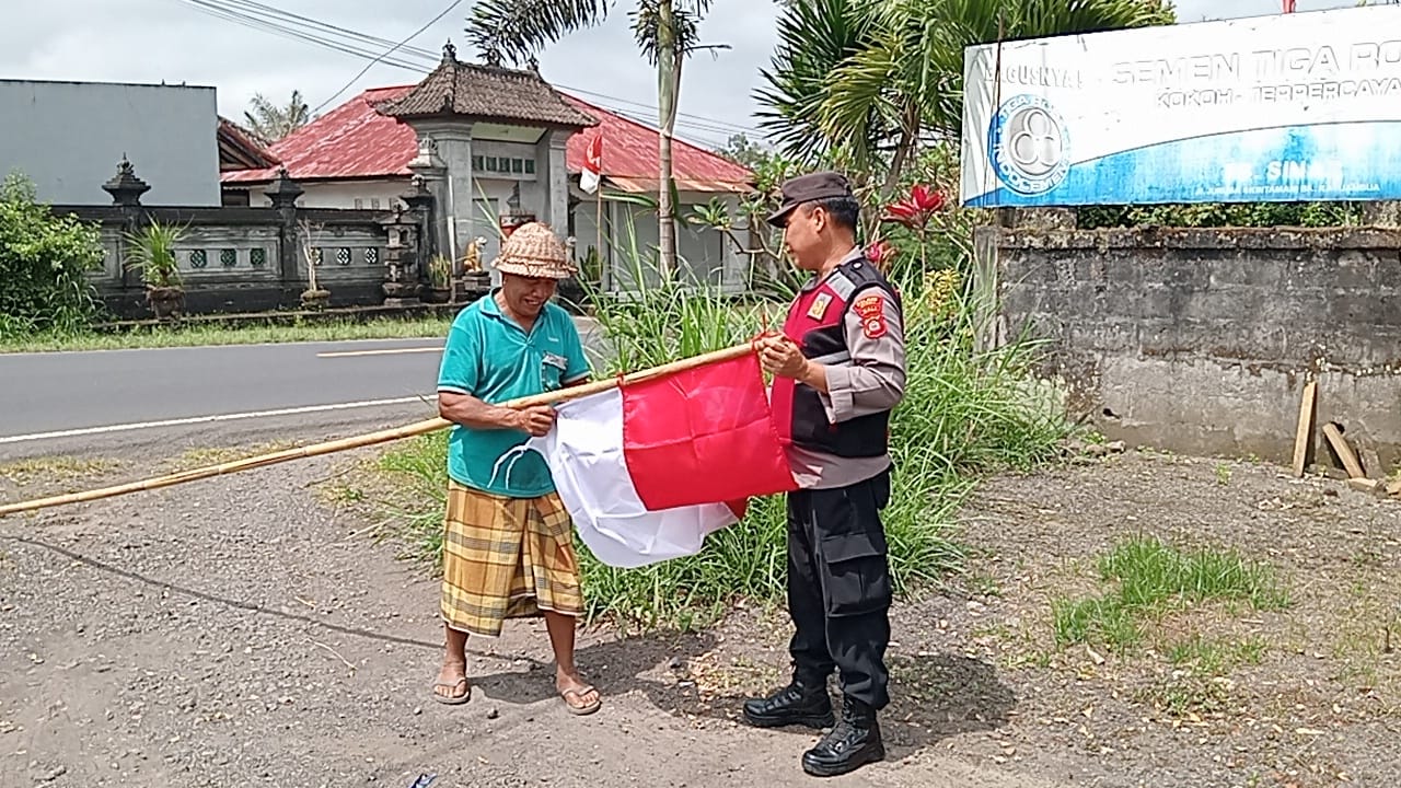 Gemakan Rasa Nasionalisme Jelang HUT RI ke 80, Polsek Susut Bagikan Bendera Merah Putih kewarga