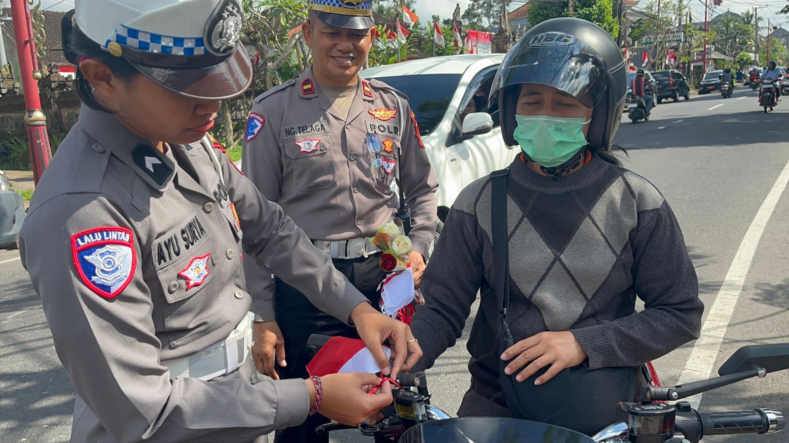 Sambut HUT ke-80 RI, Sat Lantas Polres Bangli Gelar “Gerakan Polantas Menyapa” Dan Bagi Bendera
