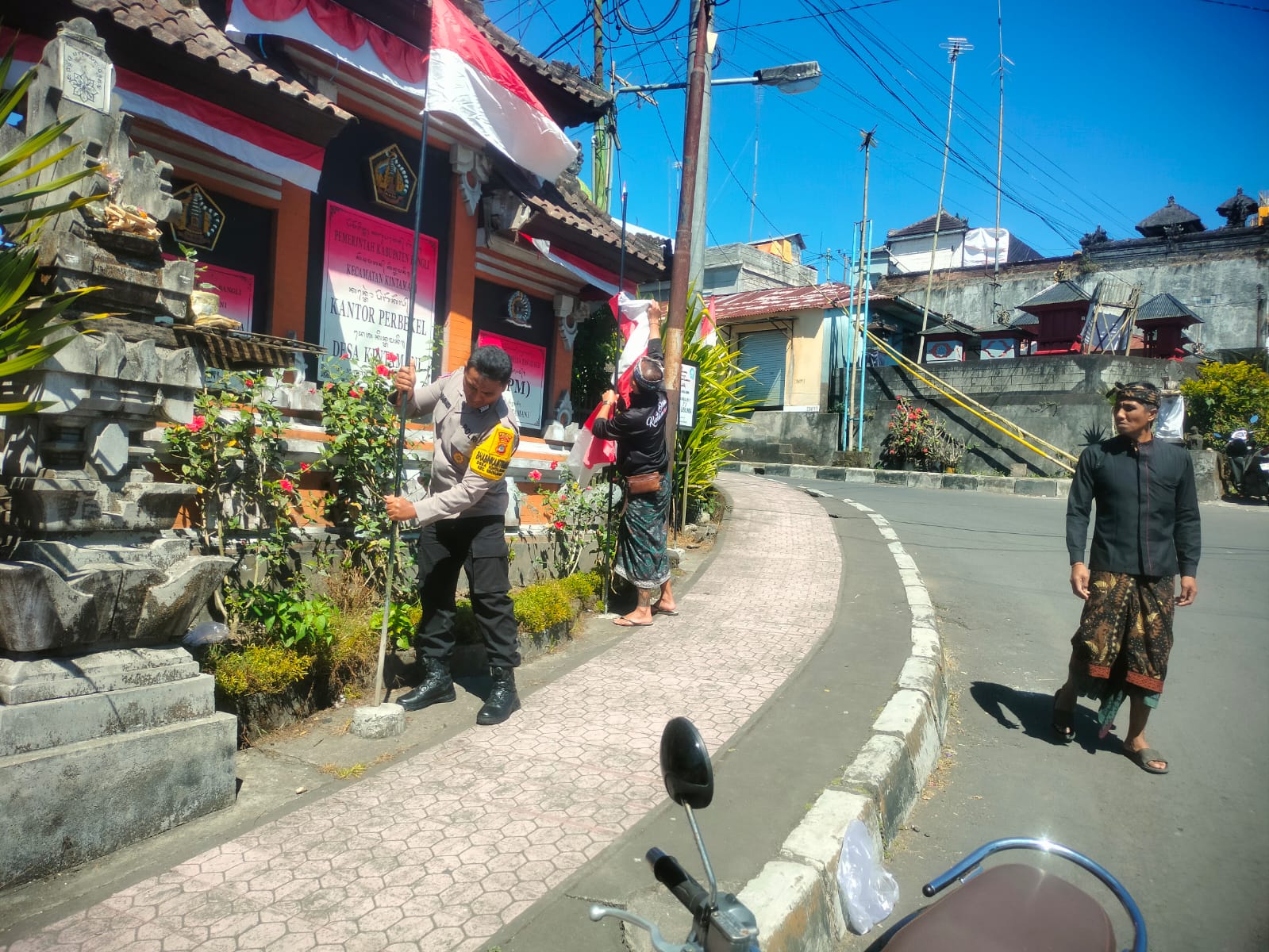 Sambut HUT ke-80 RI, Bhabinkamtibmas Polsek Kintamani Bersama Warga Pasang Bendera Merah Putih Serentak