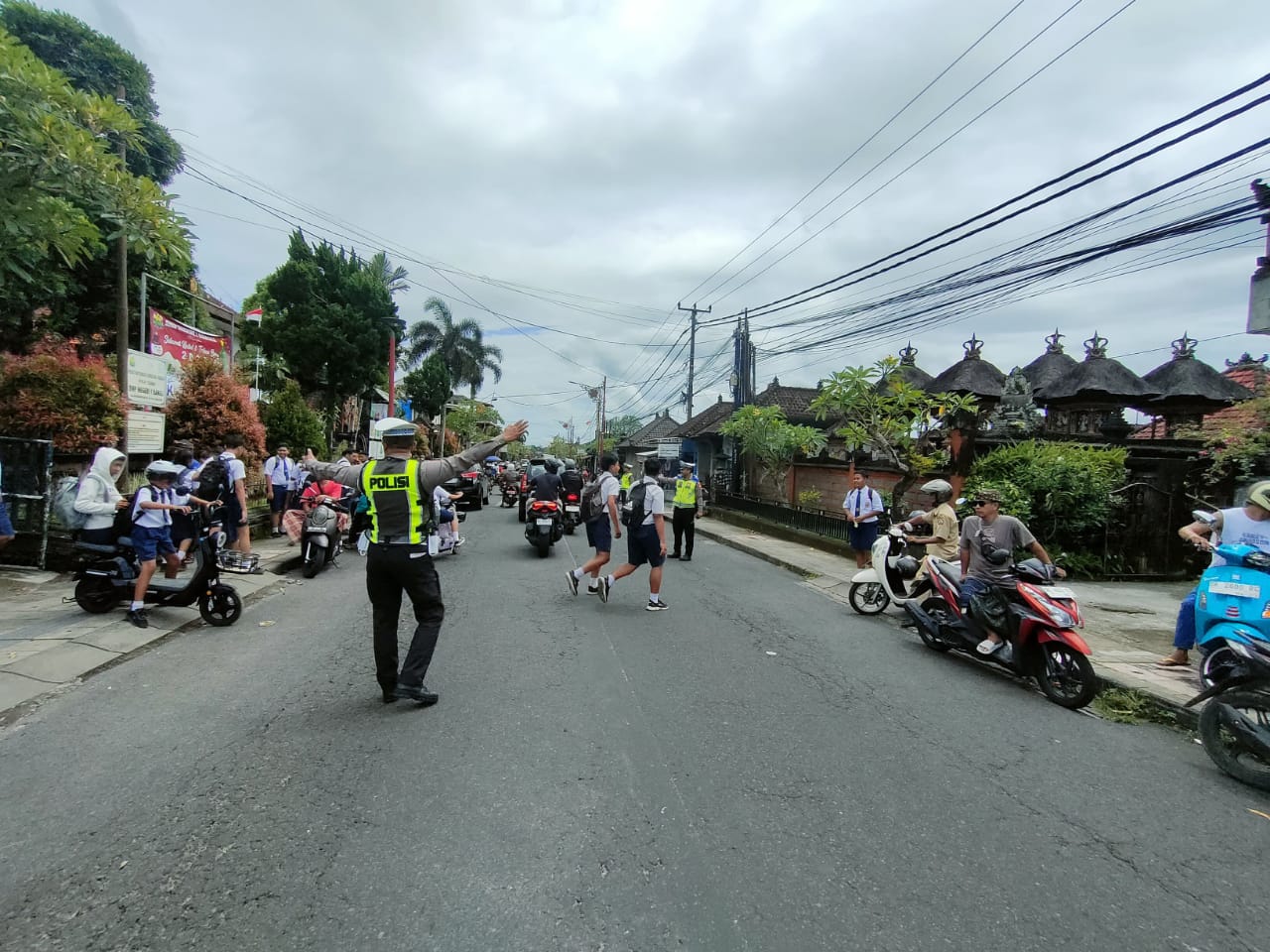 Menjaga Situasi Tetap Kondusif, Unit Lantas Polsek Bangli Laksanakan Pengaturan di Depan SMPN 1 Bangli