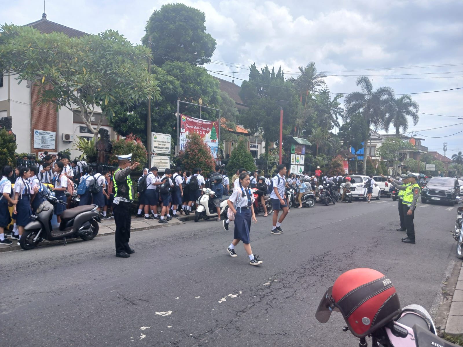 Antisipasi Bubaran Anak Sekolah, Unit Lantas Polsek Bangli Laksanakan Pengaturan di Depan SMPN 1 Bangli